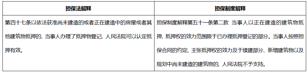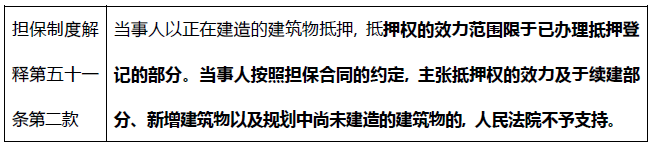 對此, 新出臺的《民法典》及最高人民法院關于適用《中華人民共和國民法典》有關擔保制度的解釋(以下簡稱“擔保制度解釋”)對此給出了確定的回答: 在建工程抵押權(quán)的效力不及于續(xù)建部分、新增建筑物以及規(guī)劃中尚未建造的建筑物。