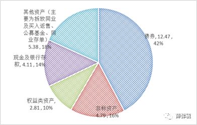 2017年,我國(guó)銀行理財(cái)29.54萬億,其大類資產(chǎn)配置狀況如下(見圖4):其一,債券投資占比42.2%,約12.47萬億,兼顧收益性與流動(dòng)性。其二,非標(biāo)和權(quán)益類資產(chǎn)投資占比25.7%,合計(jì)約7.59萬億,其中,非標(biāo)資產(chǎn)16.2%,權(quán)益類資產(chǎn)9.5%,后者主要是定增配資及明股實(shí)債等資產(chǎn),二者均主打收益性。其三,“現(xiàn)金及銀行存款”,以及“其他資產(chǎn)”占比32.1%,合計(jì)約9.48萬億,其中,現(xiàn)金及銀行存款13.9%,其他資產(chǎn)(主要為拆放同業(yè)及買入返售、公募基金、同業(yè)存單)18.2%,二者均主打流動(dòng)性。