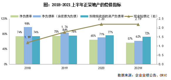 至2021上半年底,正榮有息負債713.38億元,較期初增加6.02%;若算上永續債14.17億,有息負債規模達727.55億元,較期初增加5.9%,有息債務規模維持適度增長;持有現金較期初同比增長3.44%至444.5億元。期末“三條紅線”指標處于黃檔范疇,現金短債比2.19,凈負債率57.16%,均處政策紅線內,剔除預收后的資產負債率較期初減少4.2pct至72.4%,高于70%的紅線。管理層披露,爭取2021年底進入綠檔范疇。
