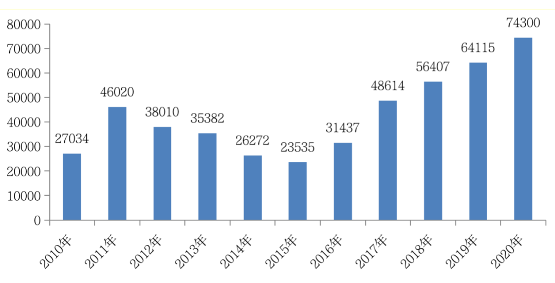 截至2020年12月31日,全國300城經(jīng)營性用地成交金額達74300億元,同比增長16%,較2019年全年14%的漲幅進一步擴大。