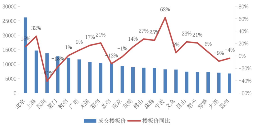 從城市排名來看,北京蟬聯(lián)成交樓板價最高的城市,平均價格為26187元/平方米,同比增加了15%;其次是上海,年內虹口、楊浦、靜安等內中環(huán)區(qū)域成交多宗優(yōu)質宅地,推升樓板價增至14700元/平方米,同比漲幅高達32%;深圳則降至第三位;廈門也因“限地價”等因素致樓板價不及上年水平,平均地價降至12689元/平方米,排在樓板價TOP20榜第4位。