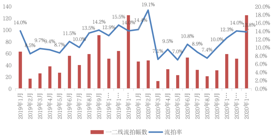 圖:2019年-2020年重點監(jiān)測城市流拍率及一二線土地流拍幅數(shù)(單位:%,幅)