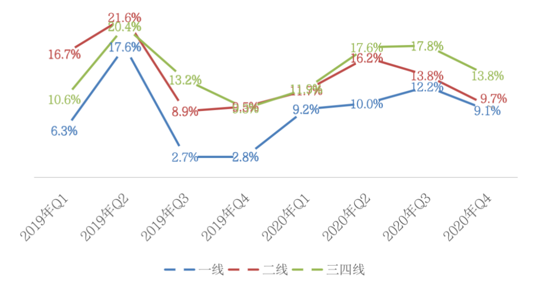 分季度來看,2020年溢價率經(jīng)歷了“先升后降”之勢:在優(yōu)質地塊大量成交、各城市降低房企拿地門檻的影響下,溢價率在2020年二季度升至高位,而受三季度后期 “三道紅線”政策出臺,房企融資渠道明顯收緊,溢價率轉而走低,四季度也基本延續(xù)了三季度的下降之勢,溢價率降至12.0%。