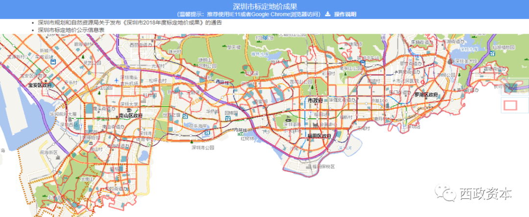 2. 標準宗地:在按用途劃分的標定區域內,有且只有一塊代表該標定區域內該用途的標準地塊,即標準宗地。以深圳市政府所處住宅用途標定區域為例(藍色方塊即是標準宗地)。