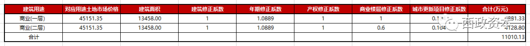 ①地上商業一層地價=商業用途土地的市場價格X地上一層商業建筑面積X建筑類型系數X年期系數X產權修正系數X地上商業樓層修正系數X城市更新項目修正系數=45151.35×13458×1×1.0889×1×1×0.104=6881.33(萬元)