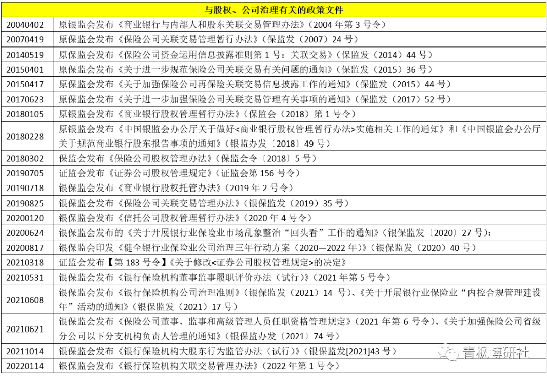 (一)公司治理不完善、股權不規范很容易導致金融體系亂象叢生、干擾金融機構正常運行,為此近年來監管部門在金融機構公司治理與股權行為整頓方面持續加大力度,并發布了一系列政策文件進行規范。具體看,