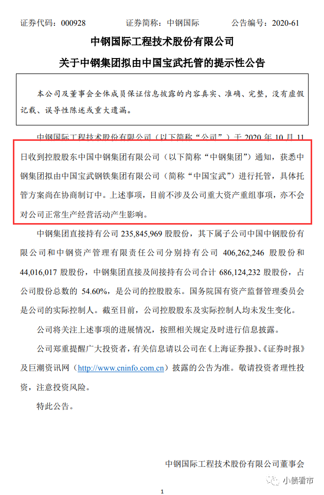 10月11日晚,中鋼國(guó)際(000928.SZ)和中鋼天源(002057.SZ)公告稱,公司于當(dāng)日收到控股股東中國(guó)中鋼集團(tuán)有限公司(以下簡(jiǎn)稱“中鋼集團(tuán)”)通知,獲悉中鋼集團(tuán)擬由寶武集團(tuán)進(jìn)行托管,但目前具體托管方案尚在協(xié)商制訂中。