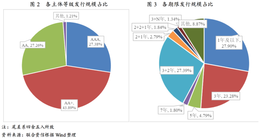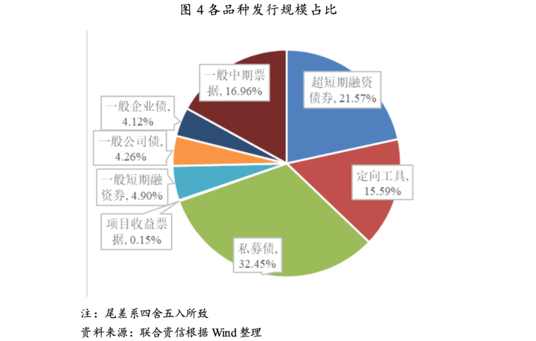 公、私募發(fā)行規(guī)模占比保持均衡態(tài)勢,公募占比略有上升;發(fā)行期限仍以中短期為主,3年期發(fā)行規(guī)模占比進(jìn)一步上升;發(fā)行品種以私募公司債和超短期融資券為主,一般中期票據(jù)和定向工具發(fā)行規(guī)模快速增長。