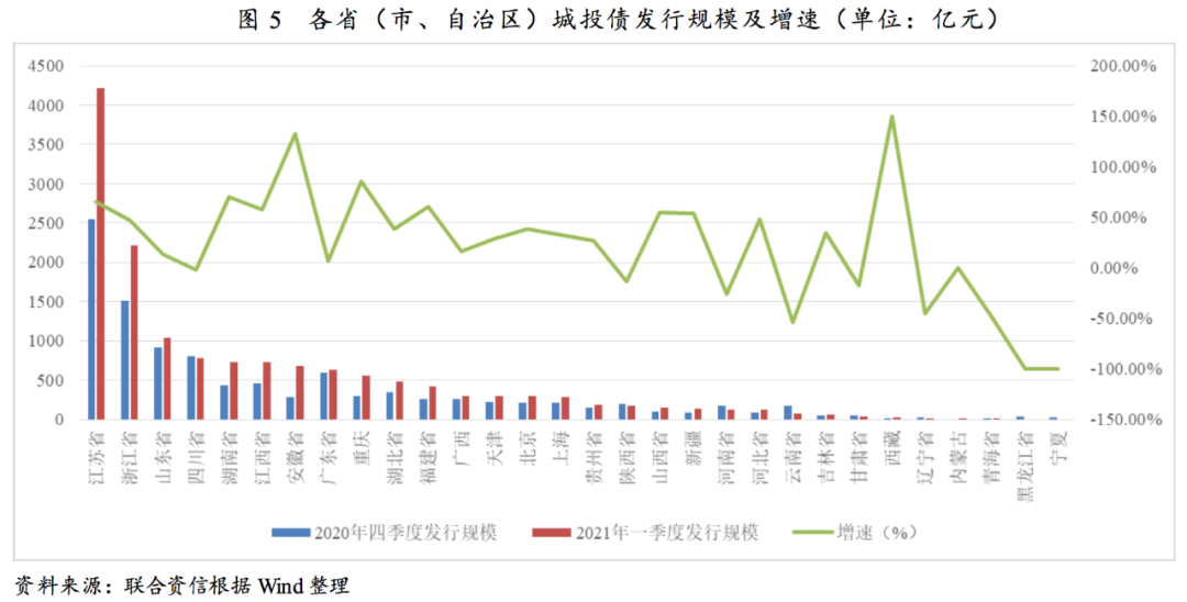 受2021年再融資需求擴(kuò)大及市場情緒修復(fù)的影響,一季度城投債發(fā)行數(shù)量及規(guī)模大幅增長。
