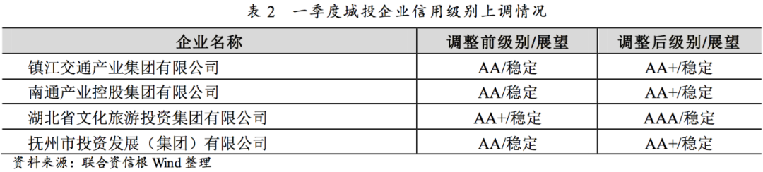 一季度,主體級別調(diào)升的城投企業(yè)共4家,其中,主體級別自AA上調(diào)至AA+的城投企業(yè)3家,AA+上調(diào)至AAA的城投企業(yè)1家;主體信用級別調(diào)升的城投企業(yè)位于江蘇省、湖北省和江西省。