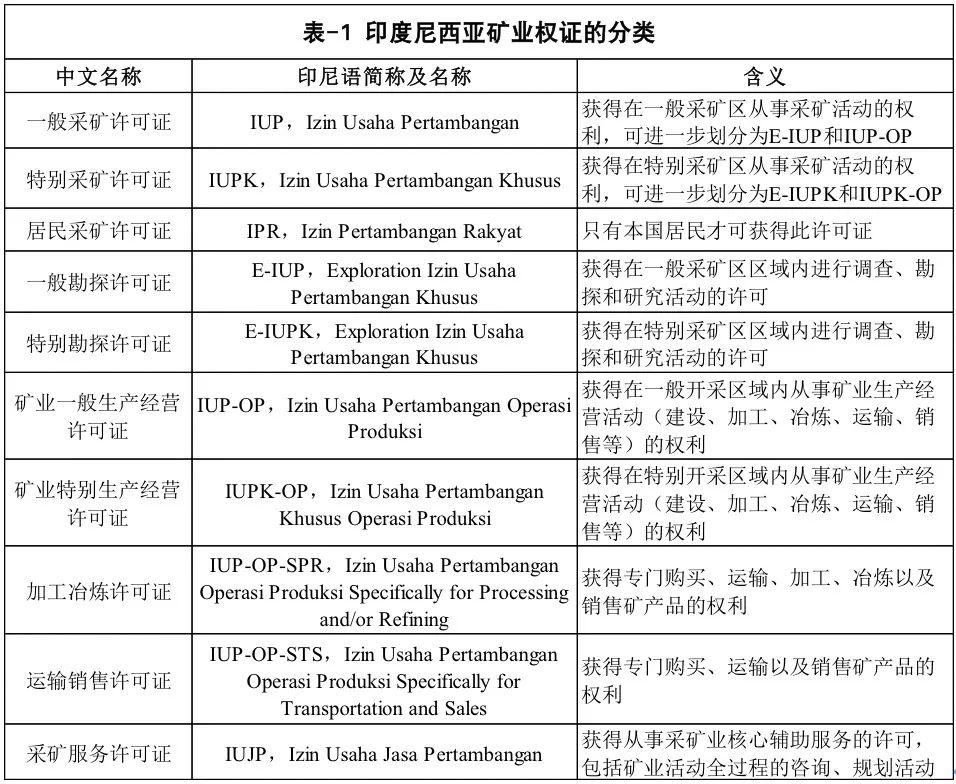 依據(jù)印尼《礦產和煤炭礦業(yè)法》及相關規(guī)定,印尼相關的礦業(yè)權證由能礦部(MEMR)頒發(fā)。印尼礦業(yè)權證的分類是按照礦產資源的開發(fā)順序(調查、勘探、可行性研究、礦區(qū)建設、開采、加工冶煉、運輸銷售等階段)進行的,因此種類較多,且彼此之間的適用范圍存在一定程度的重疊,可能會導致外國投資者對申請何種礦業(yè)權證并不十分清楚。印尼礦業(yè)權證主要可分為一般采礦許可證(IUP)、特殊采礦許可證(IUPK)和居民采礦許可證(IPR),其中IPR只有本國居民才可獲得。IUP和IUPK按照礦業(yè)開發(fā)活動的時序可分為E-IUP(一般勘探許可證)和E-IUPK(特別勘探許可證)、IUP-OP(礦業(yè)一般生產經(jīng)營許可證)和IUPK-OP(礦業(yè)特別生產經(jīng)營許可證)、IUP-OP-SPR(加工冶煉許可證)、IUP-OP-STS(運輸銷售許可證),以及IUJP(采礦服務許可證)和IPB(巖石開采許可)等,如表-1所示: