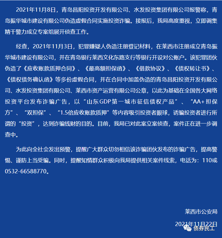 1、2021年11月22日,某李鬼城投公司(青島振華城市建設(shè)有限公司)假冒“水發(fā)投資集團(tuán)有限公司”和“萊西市資產(chǎn)運(yùn)營(yíng)有限公司”的名義在某平臺(tái)發(fā)行定融產(chǎn)品“青島萊西振華城建2021應(yīng)收債權(quán)”,直接被公安機(jī)關(guān)認(rèn)定為詐騙并發(fā)布預(yù)警。從李鬼城投公司的公司名稱可以看出,相關(guān)不法分子深諳城投公司的特點(diǎn),明顯是在公司名稱上碰瓷城投公司,同時(shí)利用虛假的合同材料,企圖以城投公司的信用發(fā)行產(chǎn)品。