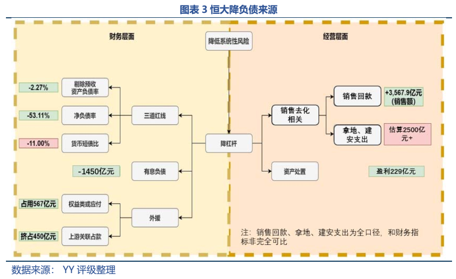 既然多賣房子少拿地沒有達成,那有息債務又是如何降下來的呢?我們站在境內發債主體恒大地產和境外母公司中國恒大兩個視角來看。