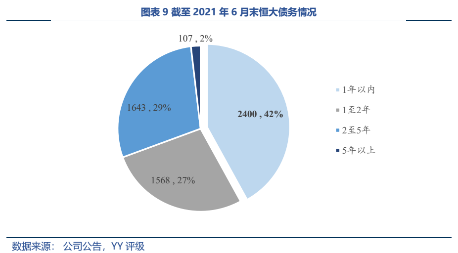 雖然凈負債率指標轉綠,但恒大現金短債比卻在不斷惡化。21年6月末恒大總有息債務規模為5,717.75億元,42%分布于1年內到期,同時,貨幣資金為1,616.3億元,且受限比例達46%,短期的償債壓力仍是一把項上懸劍。