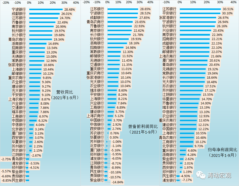 其中,撥備前利潤同比增速從高到低依次為江蘇銀行(28.65%)、寧波銀行(28.52%)、成都銀行(27.85%)、青島農商行(23.65%)、齊魯銀行(22.93%)、南京銀行(22.62%)、長沙銀行(21.78%)。撥備前利潤同比增速較低的銀行主要有紫金銀行(-14.84%)、貴陽銀行(-10.57%)、民生銀行(-10.16%)、青島銀行(-8.99%)、江陰銀行(-8.71%)、浦發銀行(-6.05%)、鄭州銀行(-6.95%)、廈門銀行(-5.16%)、北京銀行(-1.14%)和蘇州銀行(-1.06%)。