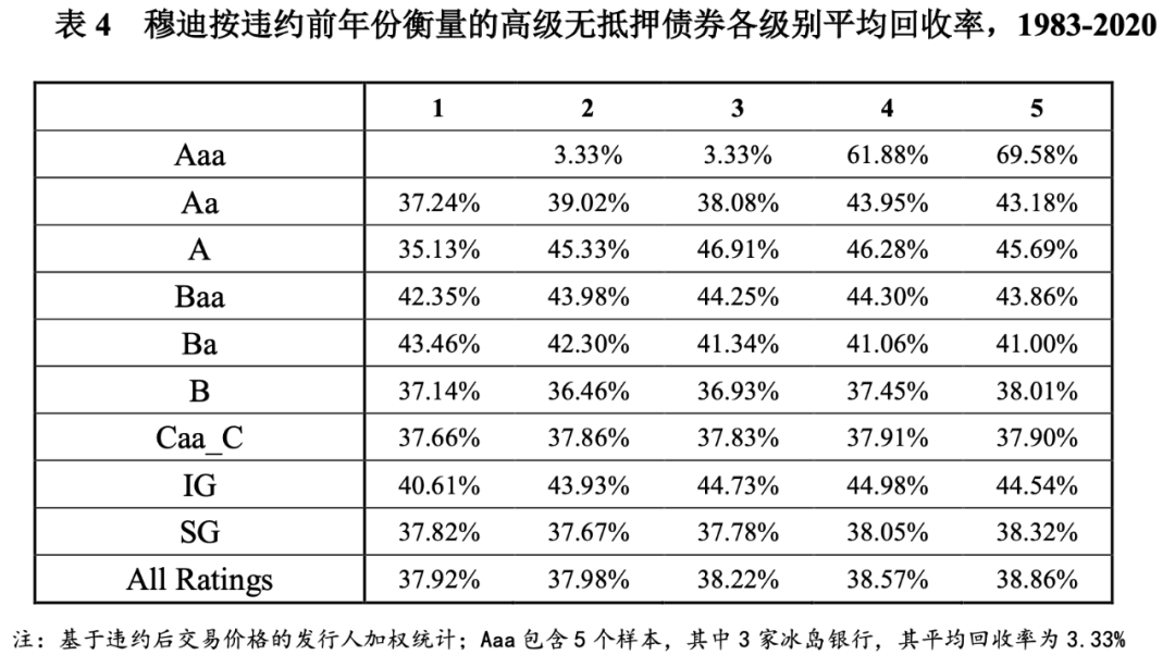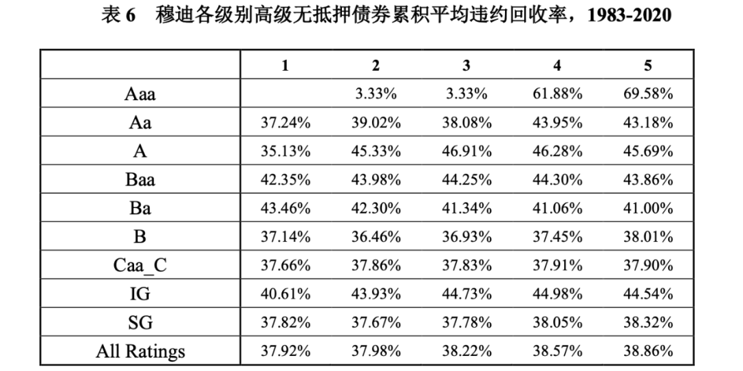 根據(jù)穆迪公開資料顯示,平均違約回收率是指特定信用級(jí)別的債務(wù)工具多年期平均違約回收水平。以2020年度報(bào)告為例,表4列出高級(jí)無抵押債券在違約前一年至前五年對(duì)應(yīng)的信用級(jí)別的平均回收率,違約前2年為B級(jí)別的平均回收率為36.46%,是指違約兩年前為B級(jí)的高級(jí)無抵押債券在兩年內(nèi)一定時(shí)間的平均回收率水平為36.46%。