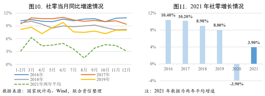 多點(diǎn)散發(fā)疫情對消費(fèi)沖擊較大。2021年我國社會消費(fèi)品零售總額(以下簡稱“社零”)44.08萬億元,同比增速12.50%,兩年平均增速3.98%,與疫情前水平差距仍然較大。疫情前2019年消費(fèi)的月度增速大概在7%左右的水平,而2021年消費(fèi)兩年平均增速則基本維持在4%~5%的區(qū)間,8月是全年的低點(diǎn),僅為1.50%,消費(fèi)仍有較大的恢復(fù)空間。消費(fèi)疲弱的短期影響因素主要有疫情多點(diǎn)發(fā)生、居民消費(fèi)與出行活動的減少,而疫情以來一直表現(xiàn)較好的網(wǎng)上實(shí)物商品銷售兩年平均增速在2021年下半年連續(xù)出現(xiàn)下滑,從7月的16.65%持續(xù)下行至12月的13.39%,或反映出消費(fèi)疲弱不僅是由于短期疫情因素的沖擊。