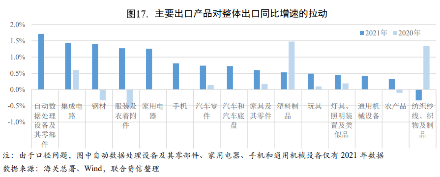 海外產(chǎn)需缺口、出口替代效應(yīng)以及低基數(shù)等因素支撐我國出口高增長。2021年主要經(jīng)濟(jì)體PMI高位運(yùn)行,全球經(jīng)濟(jì)持續(xù)恢復(fù),海外需求旺盛但產(chǎn)需依然存在較大缺口,加之東南亞疫情反復(fù)導(dǎo)致的出口替代作用,共同支撐我國出口維持高景氣度。但海運(yùn)領(lǐng)域出現(xiàn)的集裝箱運(yùn)力緊張、運(yùn)價高漲問題對出口產(chǎn)生了一定的負(fù)面影響。三季度以來出口價格上漲對出口金額的貢獻(xiàn)度上升,集成電路、手機(jī)和家用電器等受大宗商品漲價明顯的行業(yè),出口均表現(xiàn)出量減價增的特點(diǎn)。從主要出口產(chǎn)品對整體出口同比增速的拉動來看,自動數(shù)據(jù)處理設(shè)備及其零部件、集成電路依然是出口的最大拉動項;紡織紗線、織物及制品由于上年基數(shù)較高,對出口造成負(fù)向拉動。