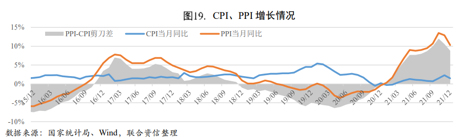 PPI-CPI剪刀差大幅擴(kuò)大。2021年1-10月,PPI與CPI剪刀差持續(xù)擴(kuò)大,成本上漲難以轉(zhuǎn)嫁,中下游企業(yè)利潤承壓。隨著年底PPI漲幅有所回落,PPI-CPI剪刀差小幅收窄,上游生產(chǎn)價格繼續(xù)上升動能減弱,價格加快向下游行業(yè)傳導(dǎo),中下游企業(yè)的成本壓力或?qū)⒌玫揭欢ǔ潭鹊木徑狻?br/>