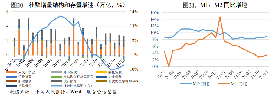 2021年,社融增速整體呈現(xiàn)高位回落的態(tài)勢,貨幣供應(yīng)量、社會融資規(guī)模的增速與名義經(jīng)濟(jì)增速基本匹配。截至12月末,社融存量余額為314.13萬億元,同比增長10.30%,比2020年末低3個百分點(diǎn)。2021年新增社融規(guī)模31.35萬億元,其中人民幣貸款是主要支撐項;政府債券同比大幅下降,但顯著高于2019年水平,發(fā)行錯期效應(yīng)使得政府債券支撐社融增速在年底觸底回升;企業(yè)債券融資同比大幅下降,與2019年同期基本持平,企業(yè)債券的融資回歸常態(tài);非標(biāo)融資規(guī)模大幅壓降,是拖累新增社融規(guī)模的主要因素。