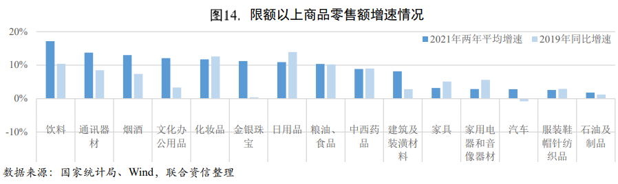限額以下商品零售和接觸性服務(wù)仍是消費(fèi)的主要拖累。2021年商品零售額同比增長11.80%,兩年平均增長4.51%,不及疫情前水平(2019年為7.90%)。商品零售與疫情前差距主要體現(xiàn)在限額以下的部分:2021年限額以下商品零售額兩年平均增速僅為3.01%,與疫情前2019年的增速水平(11.95%)相差較大。限額以上商品零售額兩年平均增速均為正值,汽車銷售上半年表現(xiàn)強(qiáng)勢,而自二季度以來受芯片供應(yīng)短缺以及排放標(biāo)準(zhǔn)升級切換期等影響較大,汽車零售額兩年平均增速多次落入負(fù)值區(qū)間。餐飲收入受疫情沖擊較大,2021年餐飲收入同比增長18.60%,兩年平均下降0.55%,餐飲消費(fèi)規(guī)模仍不及疫情前水平。餐飲收入等接觸性消費(fèi)由于對疫情變化更為敏感,整體波動較大且較疫情前水平差距較大,仍有較大的恢復(fù)空間。