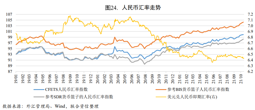 國際大宗商品漲價、人民幣升值等多重因素帶動進(jìn)口金額增長。價格因素支撐主要進(jìn)口商品金額高增長:鐵礦砂及其精礦、原油和未鍛造的銅及銅材、煤及褐煤、鋼材以及汽車和汽車底盤進(jìn)口金額增長主要由價格大幅增長拉動;僅集成電路的數(shù)量增速高于價格增速,表明數(shù)量因素對金額增長的貢獻(xiàn)大于價格拉動。多數(shù)商品呈現(xiàn)量減價揚(yáng)的特點(diǎn),國際大宗商品價格的上漲抑制了部分國內(nèi)需求。此外,2021年以來人民幣匯率三大指數(shù)同步提升,人民幣升值一定程度上也對擴(kuò)大進(jìn)口產(chǎn)生了積極作用。