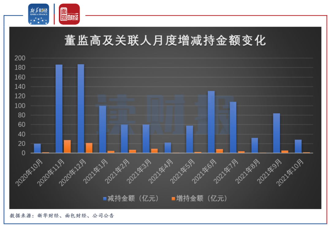 新華財經和面包財經根據上市公司的信披數據統計,2021年10月,滬深兩市上市公司董監高及其關聯人減持金額合計約28.19億元,涉及69家公司;增持金額合計約1.5億元,涉及36家公司。增、減持金額相抵之后,凈減持金額26.69億元。