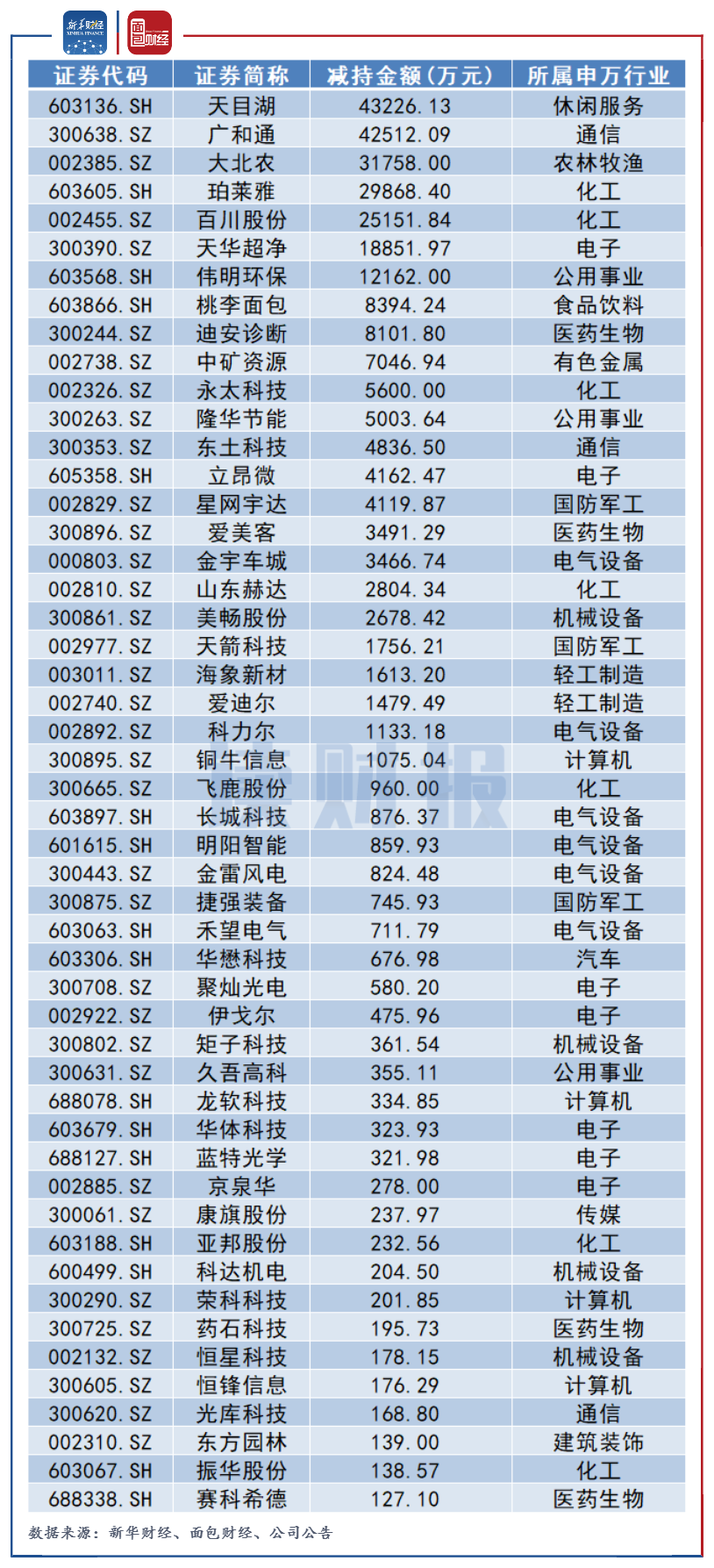 化工行業減持金額再居首 天目湖與廣和通減持均超過4億元