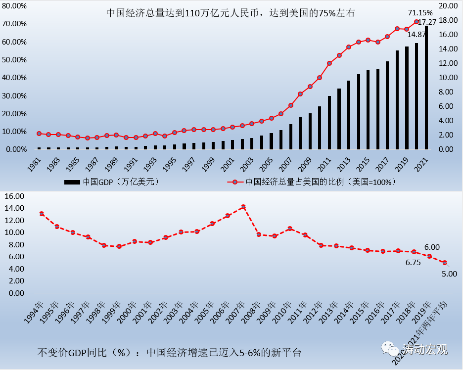 2021年12月11日,中財辦韓文秀副主任指出2021年中國經濟總量將達到110萬億元人民幣(按照6.37的匯率測算約為17.27萬億美元),相當于美國經濟總量的75%左右,較2020年經濟總量突破100萬億元人民幣又進了一步。