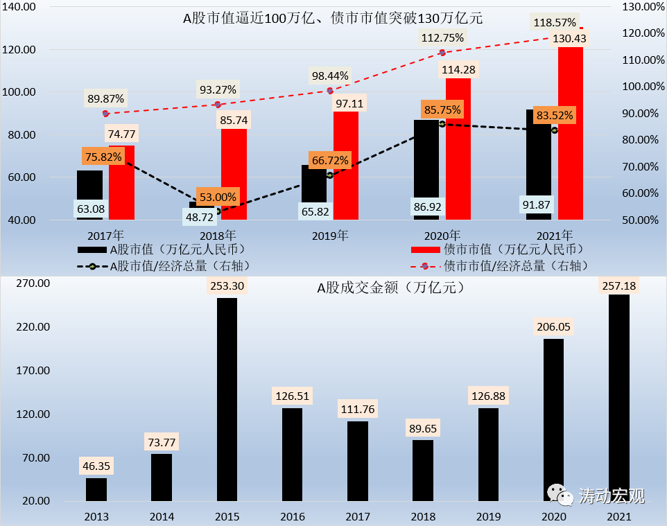 股票市值和債市市值占經濟總量的比例,往往代表著一體經濟體的金融深化程度,數值上顯示,2021年A股市值和債市市值已分別達到91.87萬億和130萬億元左右,占經濟總量的比例亦分別達到90%和120%左右。