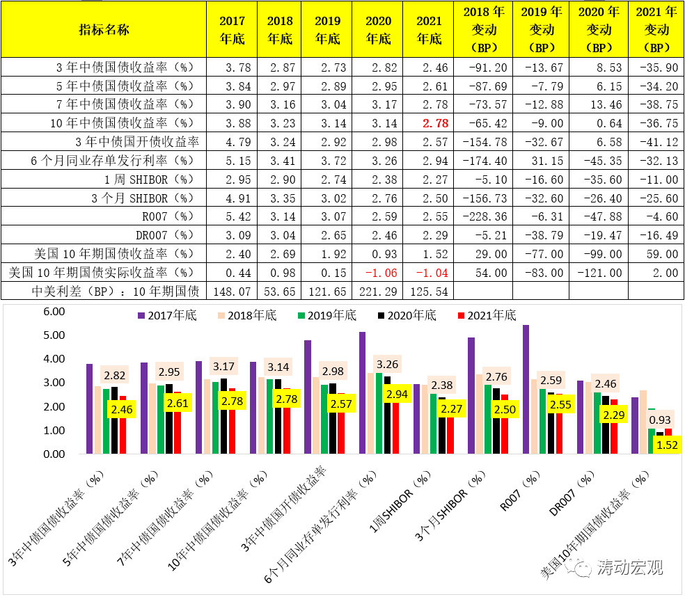 如果不考慮2020年的特殊年份,則中國債市自2018年起已連續牛了四年。以10年期中國國債收益率為例,2018年下行65.42BP、2019年下行9BP、2020年微幅上揚0.64BP、2021年下行36.75BP,也即2018年以來已累計110BP,而10年期國債收益率亦已降至2.80%以下,中美利差相應收窄至120-130BP之間。