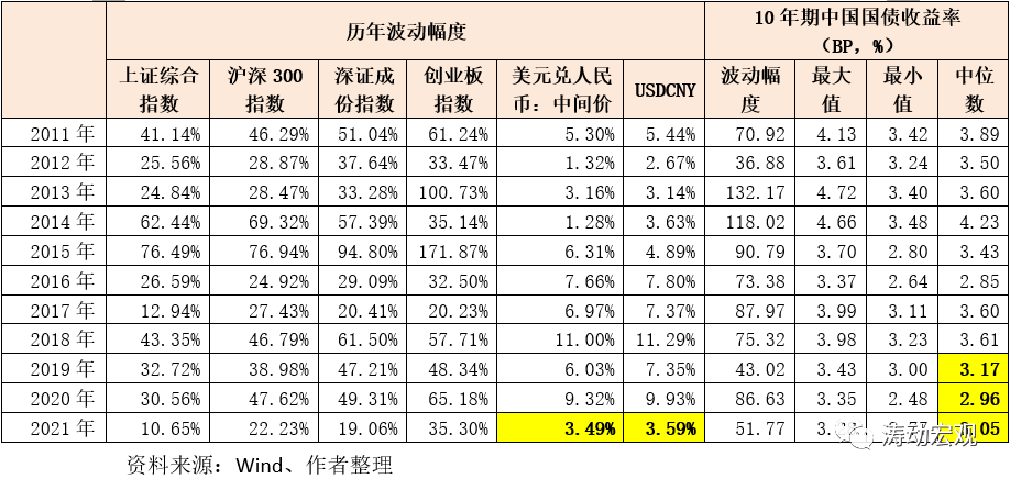 2021年,上證指數波動幅度僅有10.65%,創歷年最低:人民幣匯率波動幅度全年不到4%,亦創2015年以來最低。而諸多政策亦表明,2022年政策層面更關注金融市場的波動率,因此我們這里列舉了股市、匯市與債市2011年以來的歷年波動率情況,以供參考。例如,撇開2020年的特殊情形,近幾年10年期國債收益率中樞水平整體呈現下行態勢,而波動幅度則穩定在40-100BP之間.