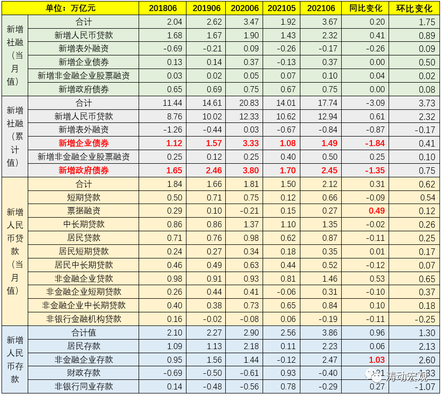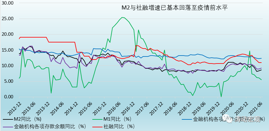 近年來的政策均明確“保持M2、社融增速與名義經(jīng)濟增速基本一致”,并以此為基礎(chǔ)保持宏觀杠桿率水平基本穩(wěn)定。雖然今年6月的M2與社融大超預(yù)期(票據(jù)融資和企業(yè)中長期貸款同比明顯多增、房貸少增、企業(yè)存款同比亦大幅多增),但增速基本上已回歸到疫情前的水平,較疫情期間下降明顯(今年前6個月企業(yè)債券和政府債券同比分別少增1.84萬億和1.35萬億、合計少增3.19萬億)。例如,2021年6月,M2、社融存量、貸款余額與存款余額同比增速分別降至8.60%、11%、12.30%和9.20%,已經(jīng)和疫情前的平均水平相當。