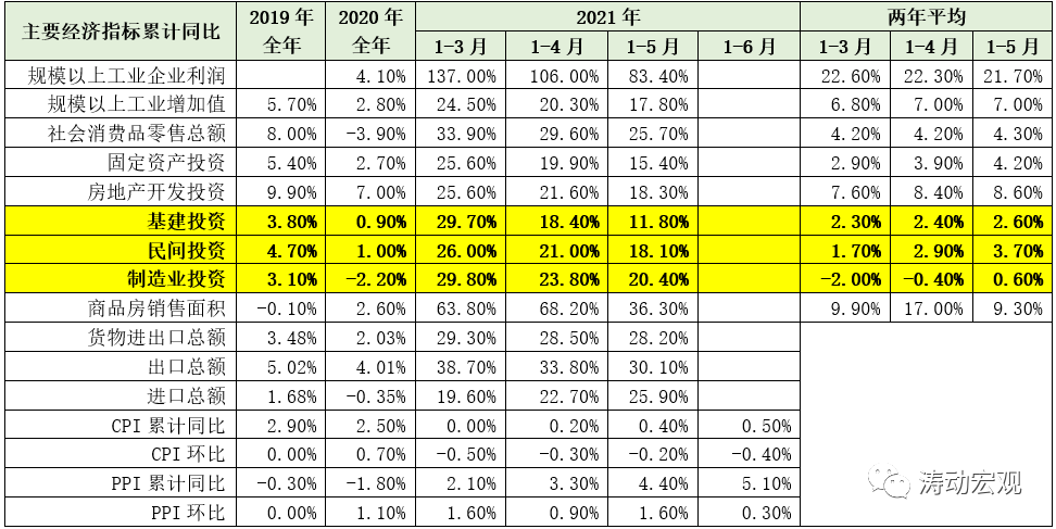 (二)從三駕馬車的表現(xiàn)來看,消費與投資等內(nèi)需整體上仍處于低位緩慢修復(fù)態(tài)勢,房地產(chǎn)投資與貿(mào)易端延續(xù)了2020年的表現(xiàn),對上半年的經(jīng)濟修復(fù)貢獻力度較大,如1-5月的房地產(chǎn)投資累計同比、貨物進出口總額累計同比分別達到8.60%和28.20%。其中,房地產(chǎn)投資累計同比的兩年平均值高達8.60%,1-5月民間投資與制造業(yè)投資累計同比的兩年平均值則分別為3.70%和0.60%,較2019年的水平還有不少距離。