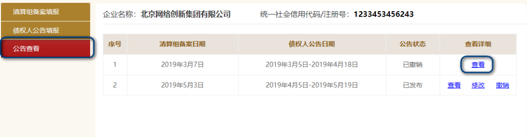 2.1進入“公告查看”頁面,在列出的清算組備案信息后點擊“查看”