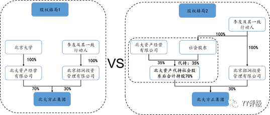 時間回到2003年,方正集團改制拉開序幕。在2003年的12月份,方正集團確定北大資產經營有限公司(后文以“北大資產”代替)持有35%的股權(出資5250萬元),北京招潤、成都華鼎和深圳康隆分別出資4500萬元、2700萬元和2550萬元,股權占比為30%、18%和17%。這一股權架構曾短暫的出現在當年北大方正集團的改制過程中,其中北大資產的實控人為教育部,而后三家的實控人均為自然人李友。這樣的改制在遭到北大相關人士的反對之后,經過一番拉鋸戰,最終成都華鼎和深圳康隆退出了改制名單,到了2005年,改制確定了最終結果:北大資產持股70%,北京招潤持股30%。2015年,方正集團管理層李友等人被有關部門調查,其后管理層更迭,待到李友出獄后,再掀波瀾。最近,北大資產一紙訴狀:聲稱當年的改制無效,北大資產應取得方正集團100%的股權。該案最終結果如何,自有法律進行判斷。但在這堪比電視劇的曲折情節中,方正集團的實控人究竟是誰,竟難以給出一個確定的結論。