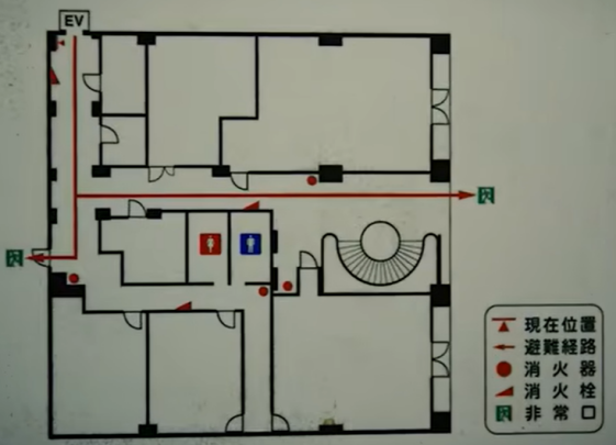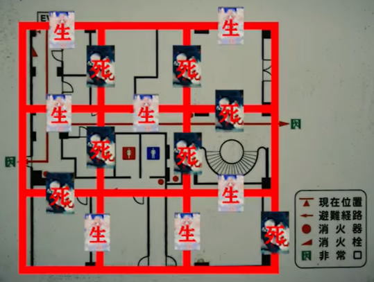 其一,密室的整體路線及配套提示設(shè)計(jì)。以知名的日本漫改、奈飛影視作品《彌留之國(guó)的愛(ài)麗絲》第一關(guān)的密室逃殺為例,整個(gè)密室以消防通道線路圖為藍(lán)本,以九宮格的形式構(gòu)建了每一處小密室的“生門”、“死門”在打開(kāi)后對(duì)應(yīng)的劇情后果,并通過(guò)長(zhǎng)度、轉(zhuǎn)角、消防圖例設(shè)施設(shè)備、NPC提示等給予玩家推測(cè)依據(jù),從而破解該密室的正確開(kāi)門選項(xiàng)和逃脫路徑。