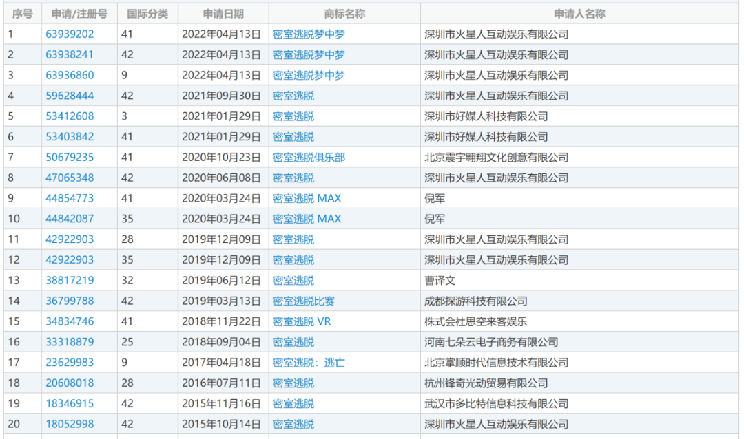 圖6:“密室逃脫”商標(biāo)注冊(cè)公示信息,查詢時(shí)間:2022年5月,來(lái)源:國(guó)家知識(shí)產(chǎn)權(quán)局