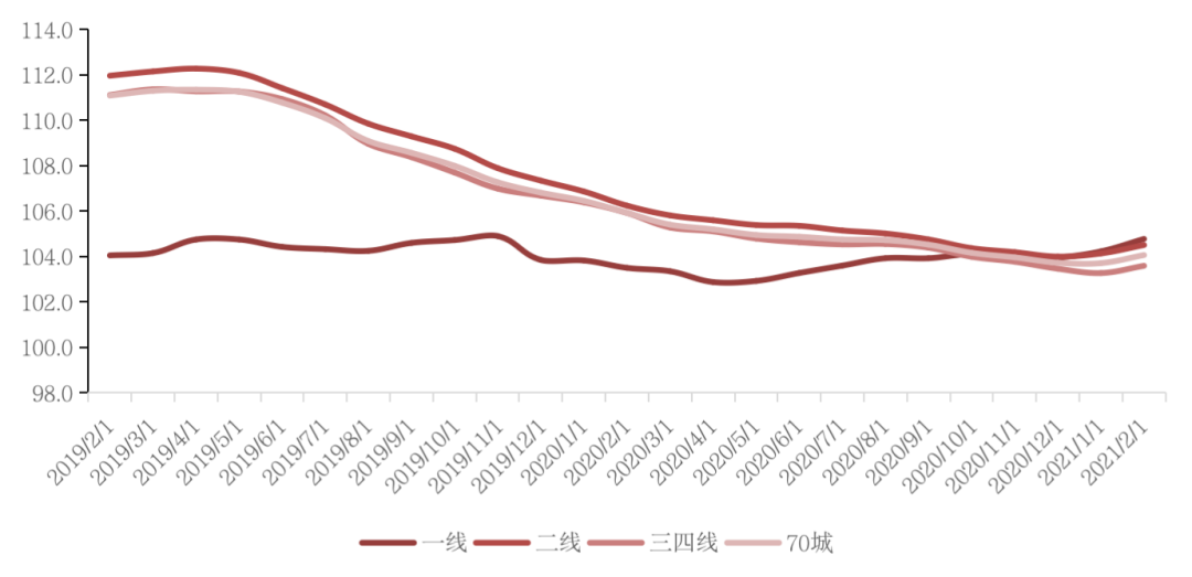 圖:2019年2月-2021年2月70城及各能級城市新建商品住宅價格指數環比走勢