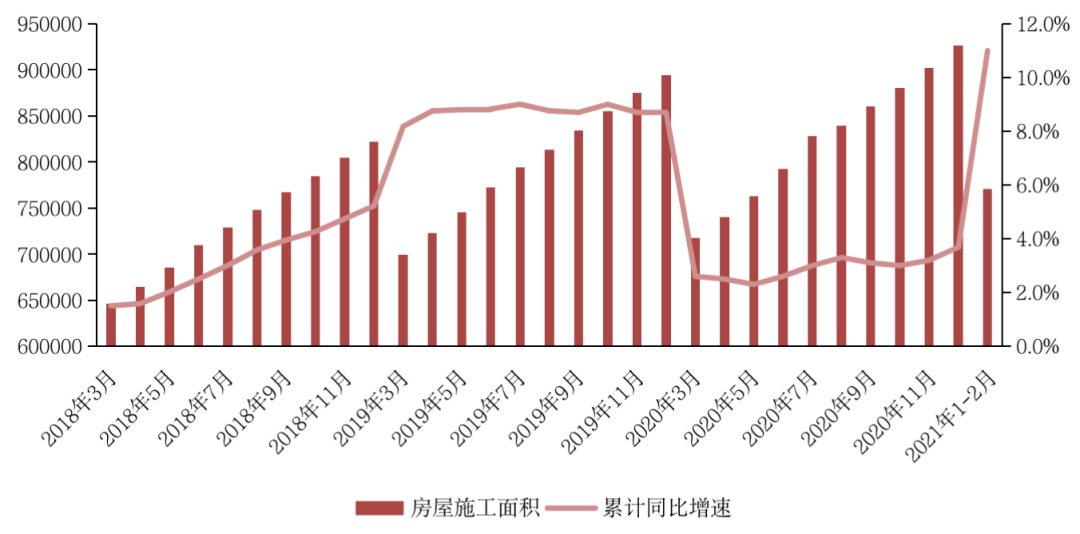 實際上,前2月房地產投資的主要支撐在于施工環節。1-2月,房地產開發企業房屋施工面積770629萬平方米,同比增長11.0%,相較2019年增長14.2%,房企加快施工進度搶占春節等營銷節點,支撐房地產開發投資保持較快增長。考慮到“三道紅線”影響,開發投資增速大幅上漲可能性不大,預計今年將呈平穩上升走勢。