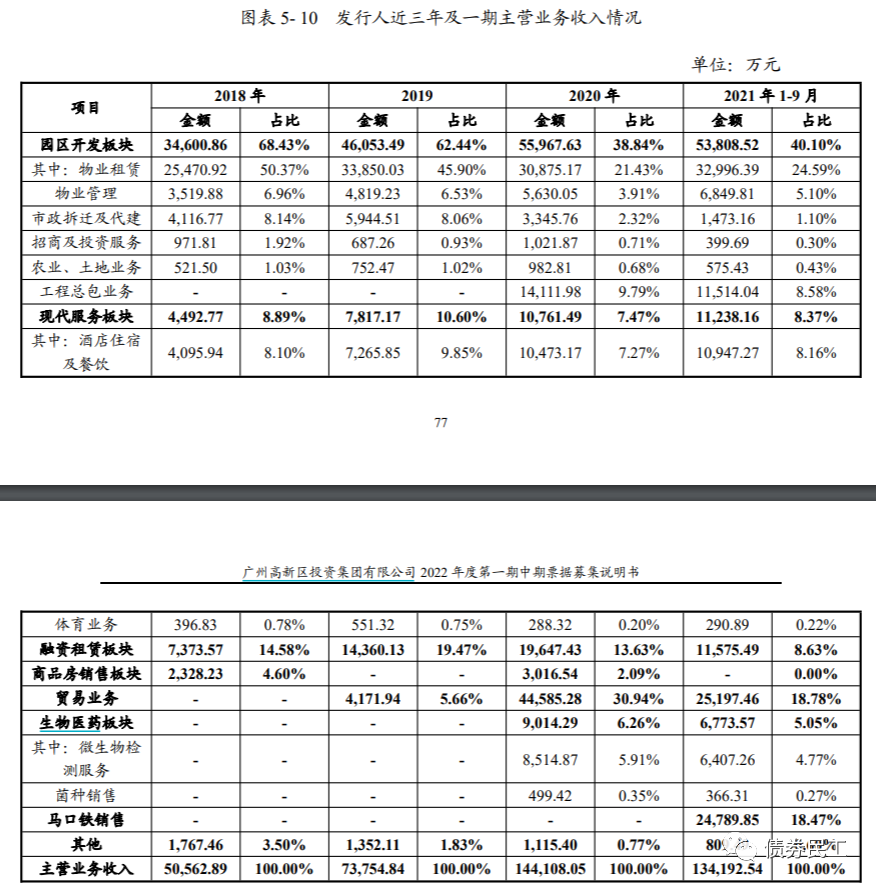 廣州高新投的實際控制人是廣州經濟技術開發區管理委員會,主體信用等級為AA+(中誠信國際、中證鵬元、東方金誠和上海新世紀)。廣州高新投的業務范圍包括園區開發板塊、現代服務業板塊、融資租賃板塊、商品房銷售板塊和貿易業務板塊等。其中園區開發板塊是廣州高新投最重要的主營業務。從業務范圍來看,廣州高新投屬于典型的城投公司。