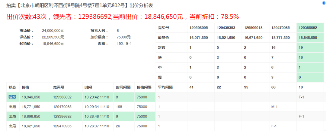 該房屋的二手市場成交價在2400萬元左右,在法拍房市場以1554萬元的價格起拍,吸引了眾多的競買者進行參拍,陸陸續續共有6人進行報名,共計出價43次,拍品成功拍出,單次加價幅度為7.5萬元,全場無人多倍加價,都是穩扎穩打,最終被競買人以公司名義,以1885萬元的價格成功拍下。
