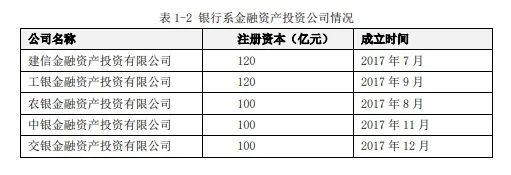 2016年10月國務院《關于市場化銀行債權轉股權的指導意見》,明確了銀行通過向實施機構轉讓債權、由實施機構將債權轉為對象企業(yè)股權的方式實現(xiàn)市場化債轉股。2017年7月20日銀監(jiān)會批準建信金融資產投資有限公司開業(yè),隨后農銀、工銀、中銀、交銀相繼獲批開業(yè),五大行的AIC成立(見表1-2),主業(yè)為市場化債轉股。