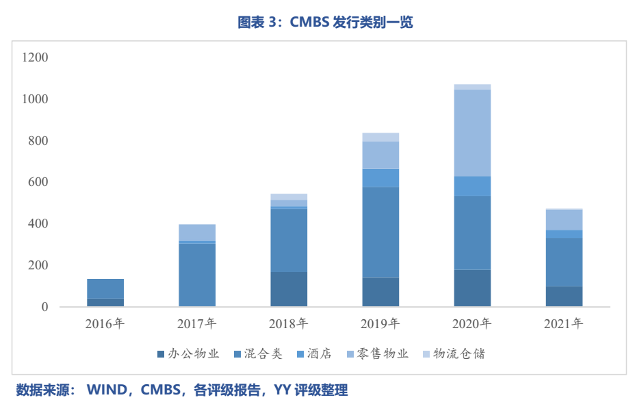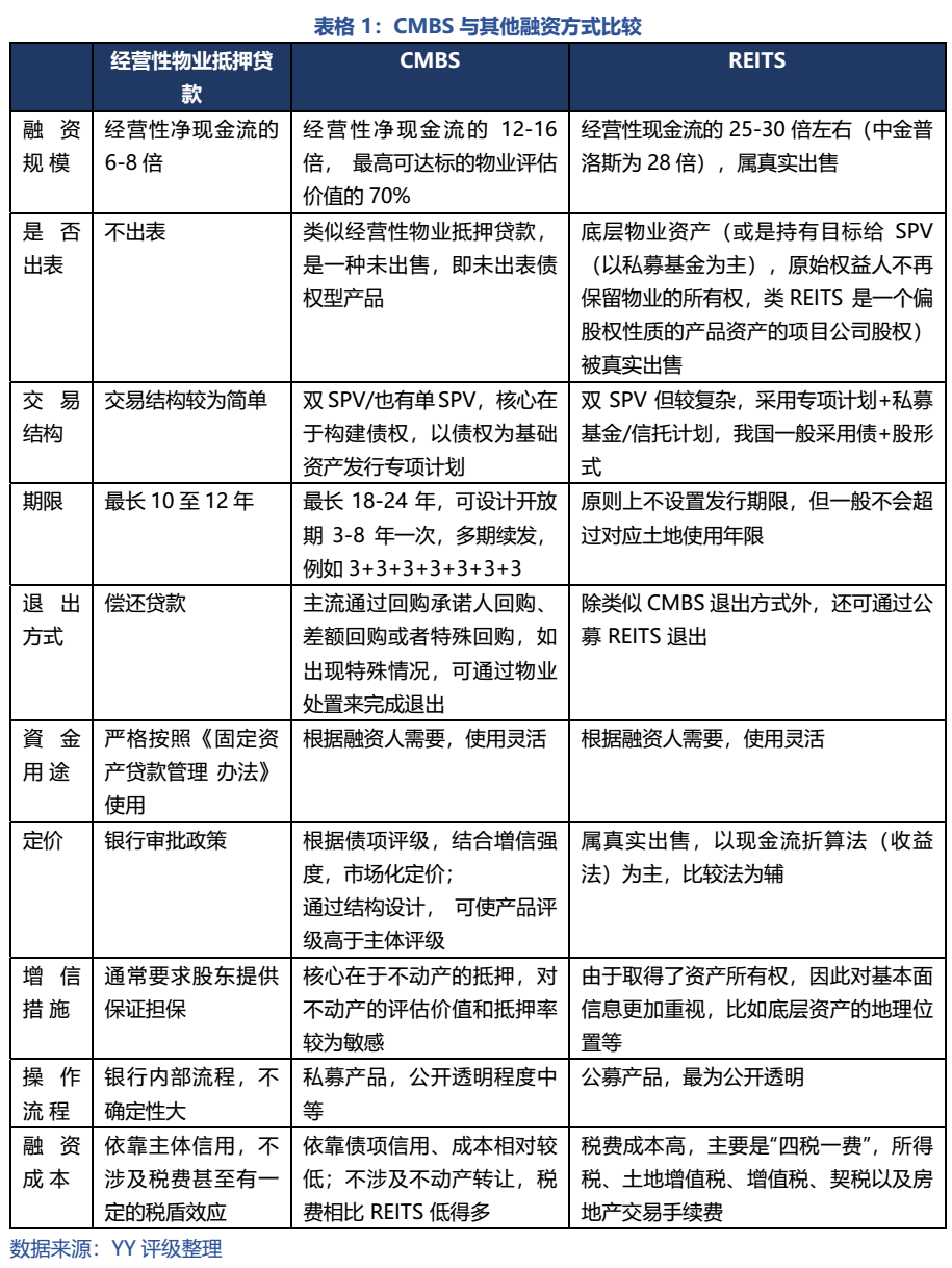 CMBS(商業(yè)地產抵押貸款支持證券)的特征為以商業(yè)地產為抵押、以相關商業(yè)地產未來收入(如租金、物業(yè)費等)為償還本息來源的資產支持證券產品。其中,商業(yè)地產往往包括一個或多個商場、寫字樓、酒店、公寓等商業(yè)地產的抵押貸款組合。而抵押貸款支持證券意味著相比REITS并不出表,往往通過信托計劃+專項計劃的雙SPV結構發(fā)行。另外,銀行間市場發(fā)行的稱為CMBN,現與CMBS大致類似,一般分類為CMBS/CMBN,下文統稱為CMBS。