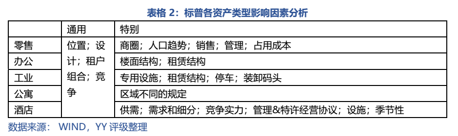 現金流分析是標普CMBS交易評級的起點。通常而言,標普將全球CMBS交易分為五種主要類型:零售、辦公、工業(yè)、公寓和酒店,并劃分了幾種資產類型通用的以及不同的對現金流的影響因素,如表2所示。
