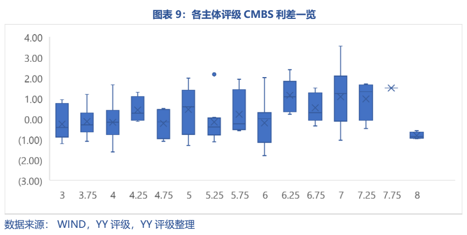 同時,以YY評級計,A1級CMBS對弱主體有較好的增信(較大的利差),但對強主體利差不明顯(也可以理解利率有下限約束)。