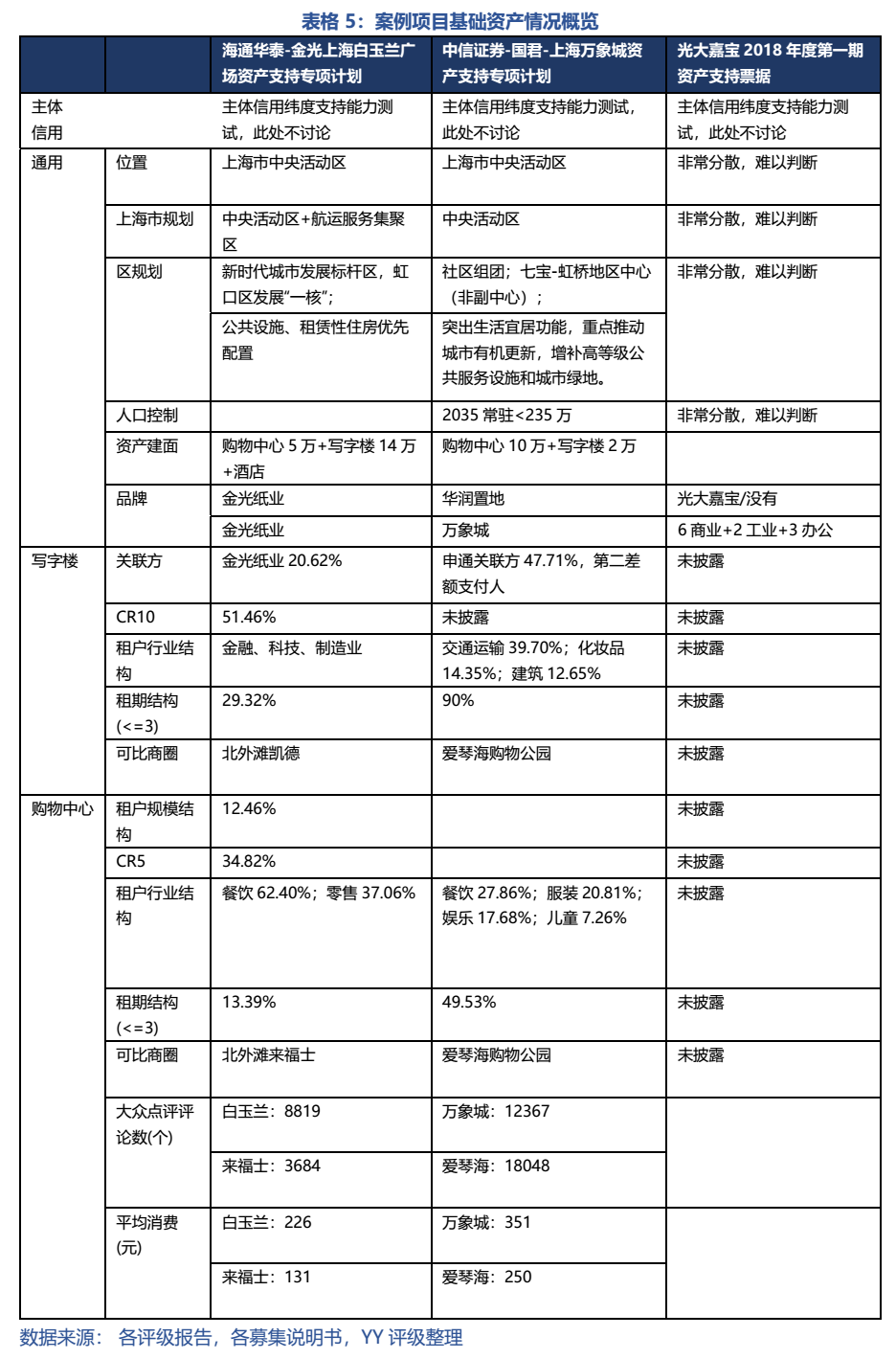 概括而言,表4的指標設計成維度定性跟蹤指標,即主體財務以反映增信風險、主體經營(品牌)以反映設計和管理風險、各級城市規(guī)劃也反映位置+競爭+人口趨勢問題以及用行業(yè)分布、期限結構來跟蹤租戶組合風險,同時關注一些可能的非經常性支出問題,如稅制改革(房地產稅)和更新改造需求(五角場萬達為10年左右后改造)。