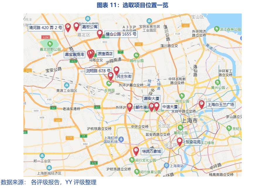 區(qū)域來看,底層物業(yè)主要分布在北京(61)、上海(48)和深圳(22),其余物業(yè)也基本在各省會或中心城市。按城市能級而言為一線城市141/282、新一線城市90/282、二線城市40/282以及三線城市11/282(安慶、三亞、揚州、舟山;除與南昌、常州、南京打包的安慶吾悅外均為熱門旅游城市的相關資產)。