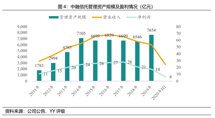 2019年末,中融信托存續信托項目997個,受托信托資產規模為7,654.5億元,在信托行業中排名第五,截至19年末已清算產品平均收益率7.79%。實現營業總收入51.7億元,居行業第二,實現凈利潤17.55億元,居行業第十一。截至19年末,中融信托總資產為 276.2億元,資產負債率為 25.0%。