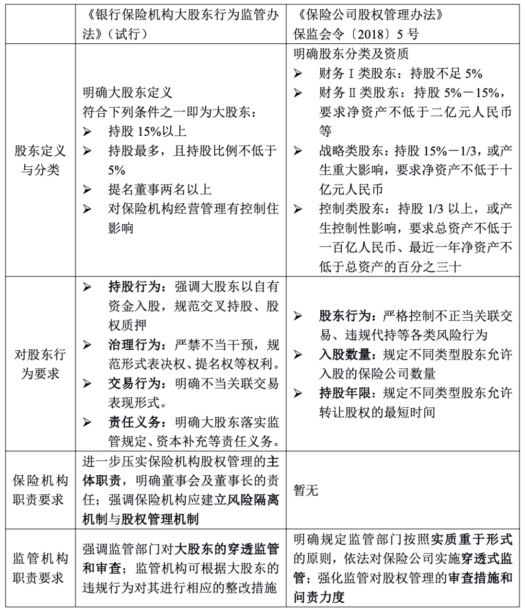 目前,對保險公司股權管理及股東行為起約束作用的監(jiān)管規(guī)定主要是《大股東監(jiān)管辦法》和《股權管理辦法》。對比來看,《股權管理辦法》對保險公司股東準入、股權管理、關聯(lián)交易等作出相應的監(jiān)管規(guī)定;《大股東監(jiān)管辦法》則重點從大股東角度出發(fā),明確其責任義務,規(guī)范其股東行為,加強事中事后監(jiān)管,是對現(xiàn)有股權監(jiān)管制度的細化補充和完善統(tǒng)一。兩個制度的對比分析具體如下: